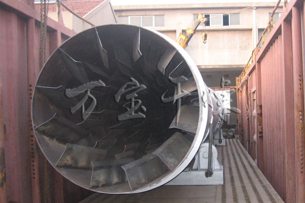 湿物料从干燥机一端投入后,在内筒均布的抄板器翻动下,物料在干燥器内均匀分布与分散,且与并流( 逆流 )的热空气充分接触 ,加快了干燥传流、传质推动力。在干燥过程中,物料在带有倾斜的抄板和热气流作用下,可调控地运动至干燥机另一端星形卸料阀排出成品。